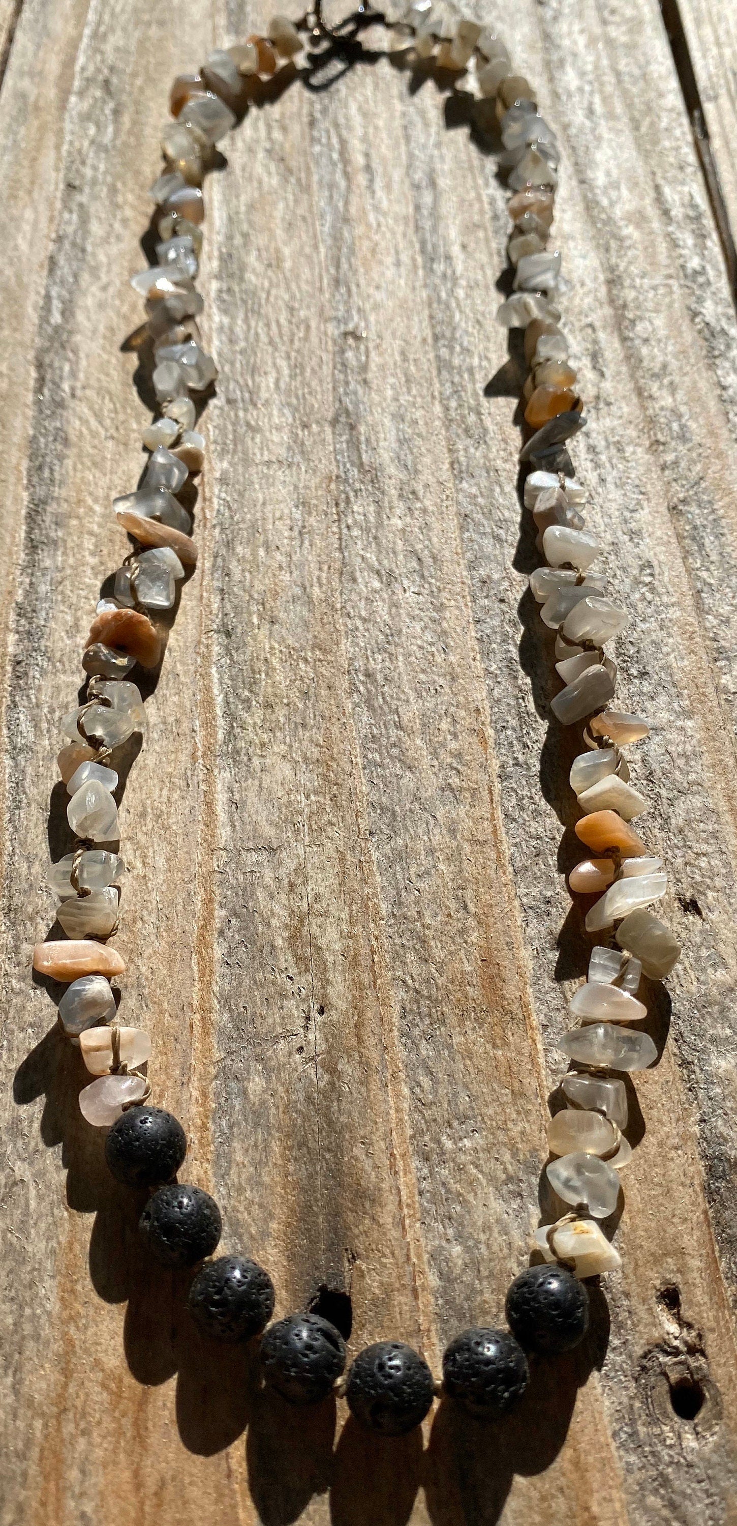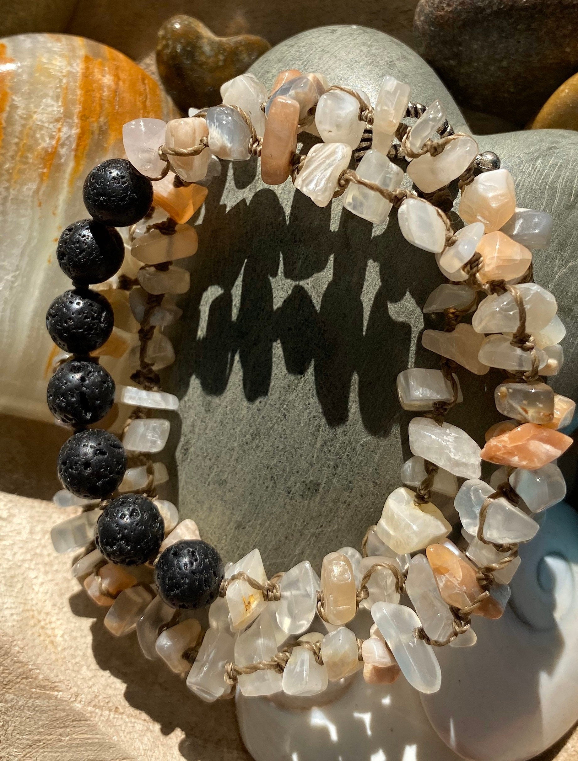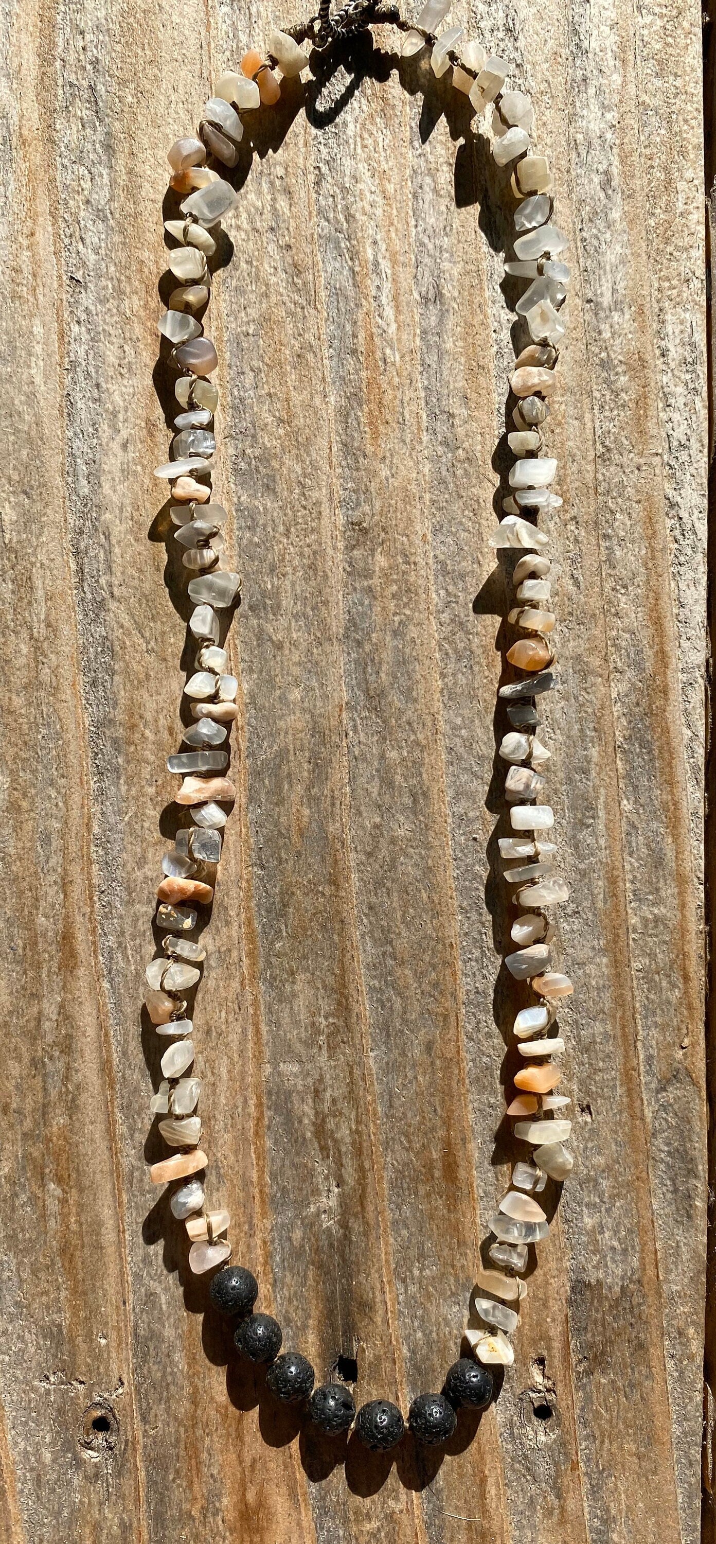 This piece is made of Moonstone chips that range in size from 5mm to 11mm and 7 Lava Stones that are about 8mm.