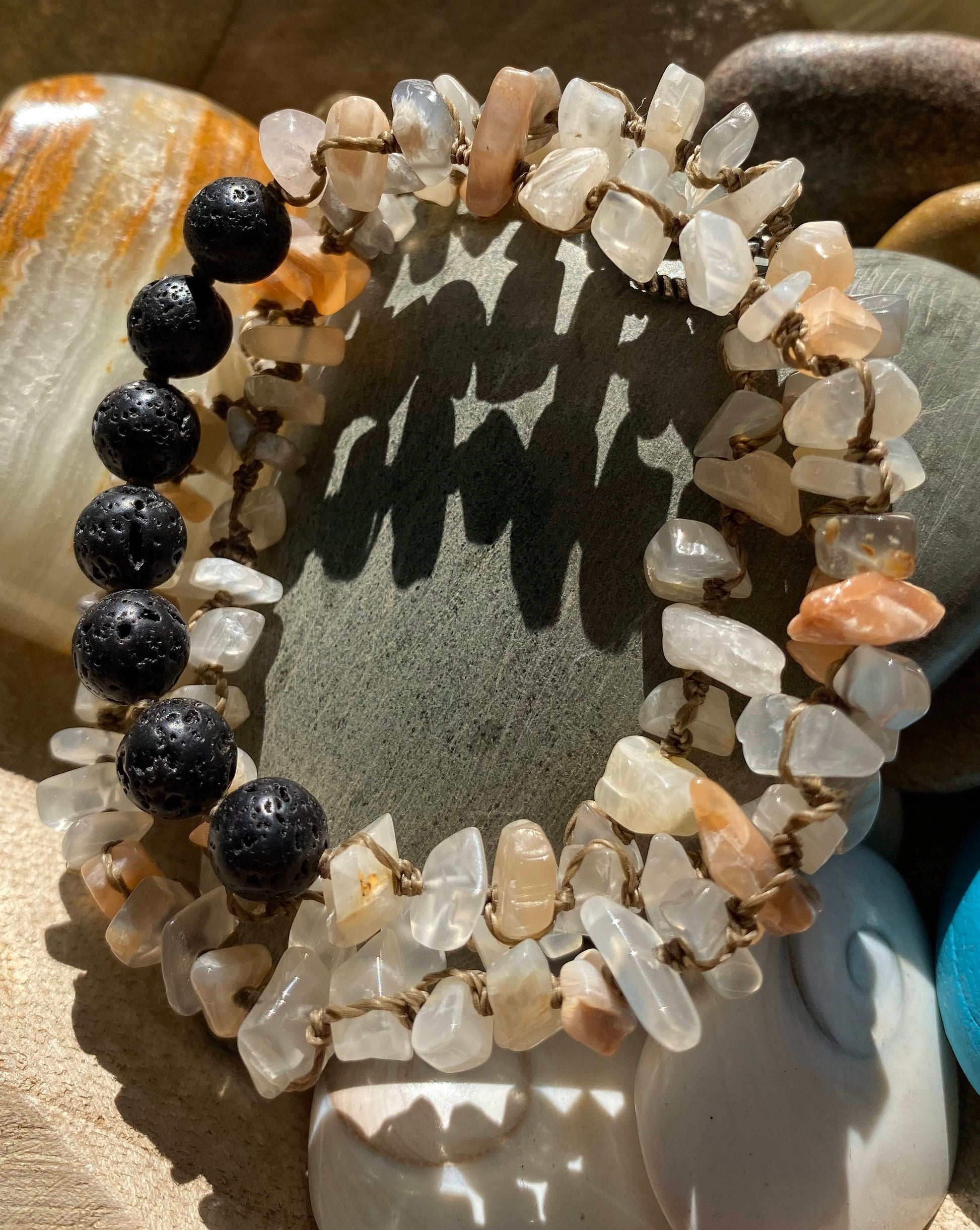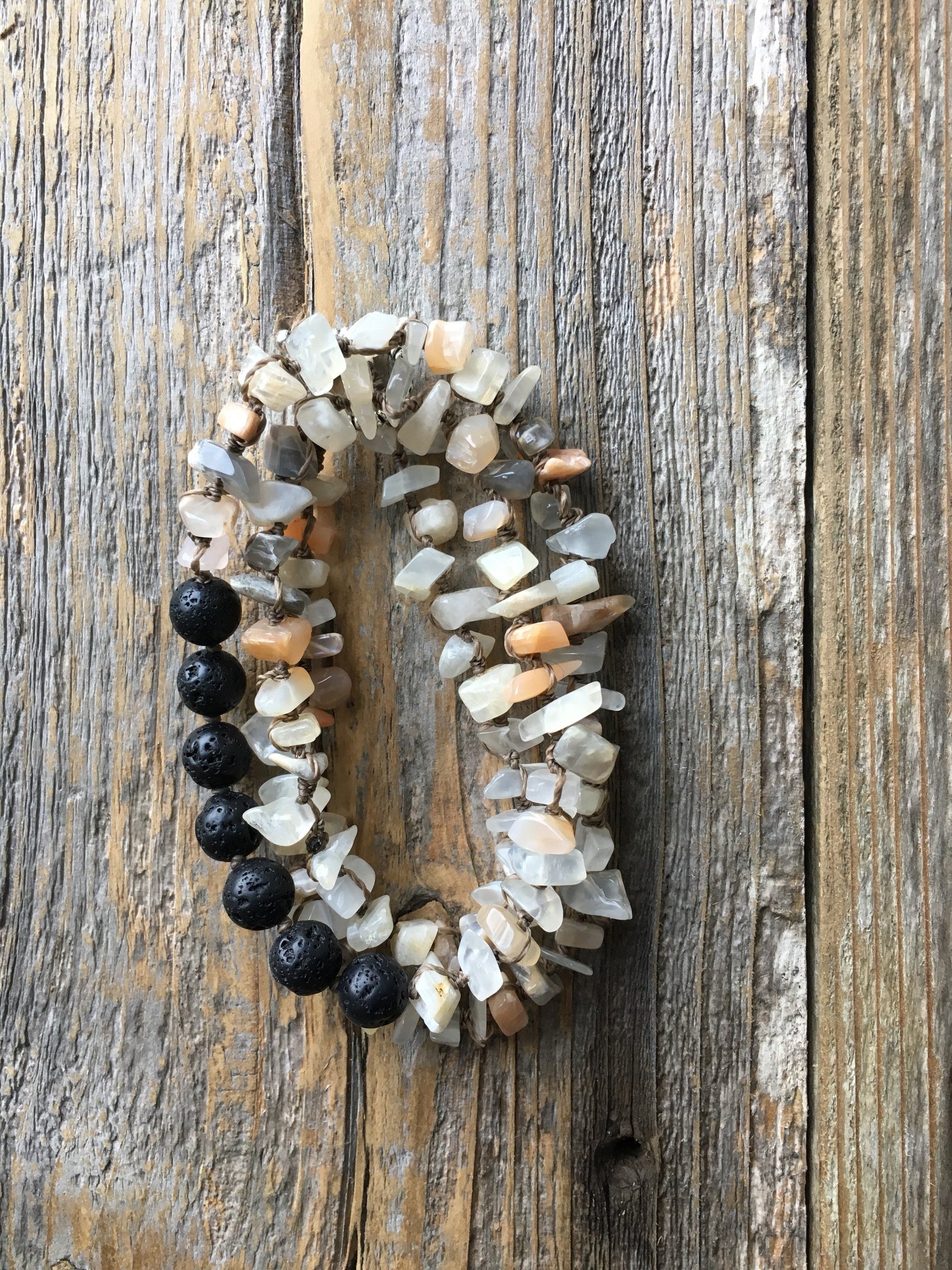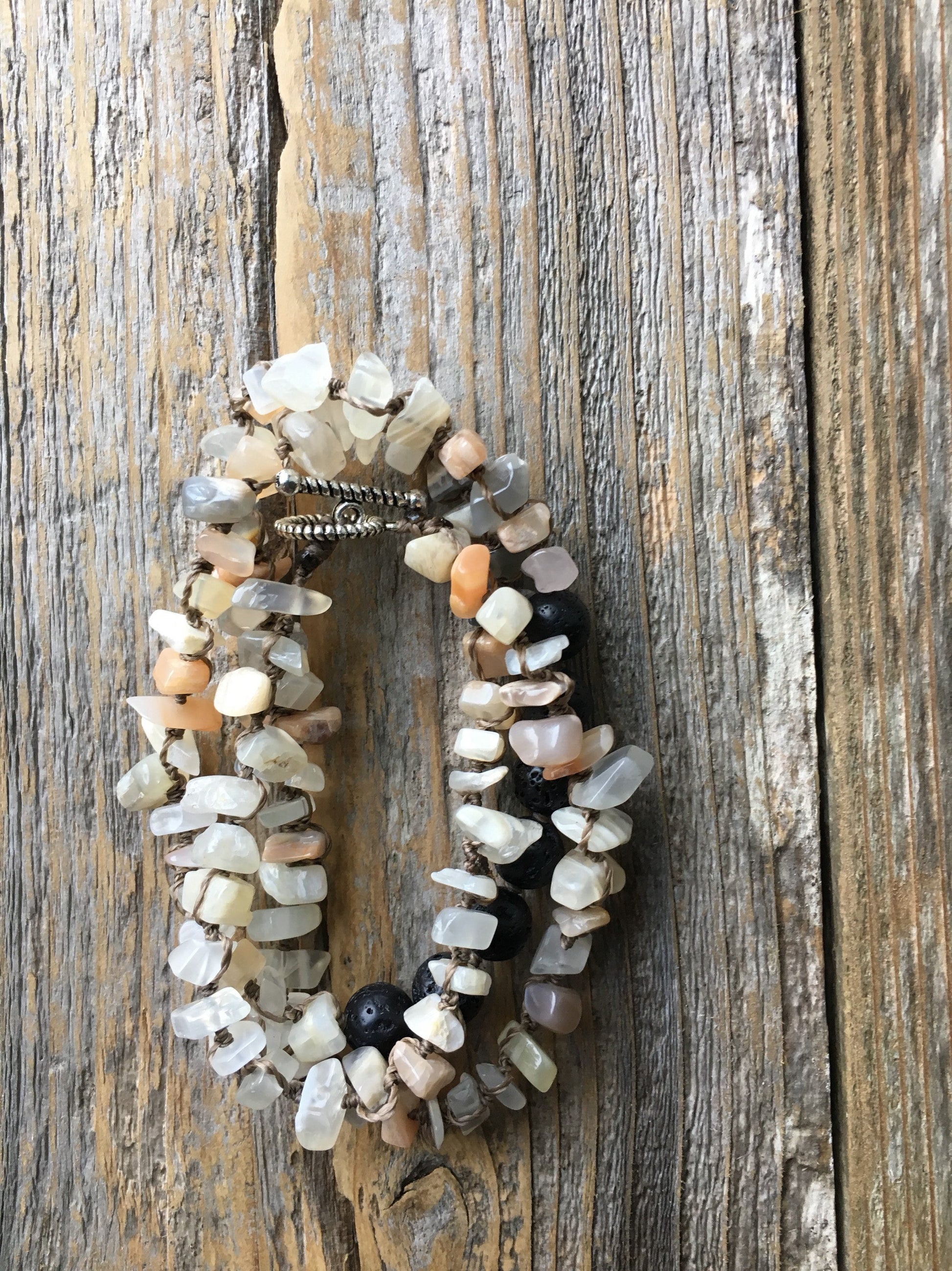 This piece is made of Moonstone chips that range in size from 5mm to 11mm and 7 Lava Stones that are about 8mm.