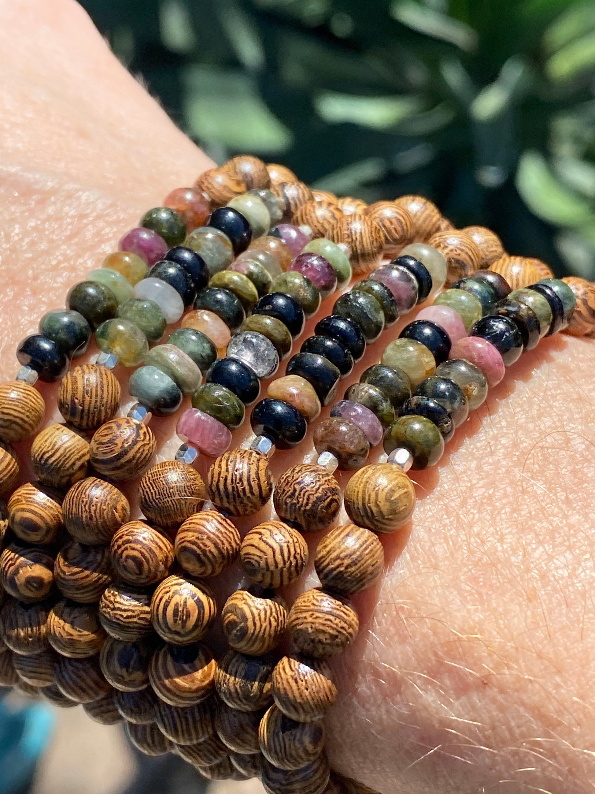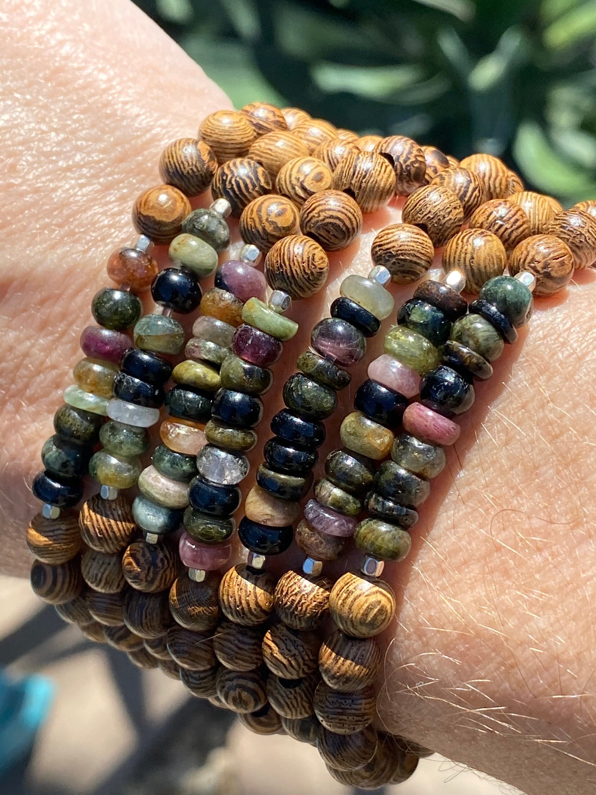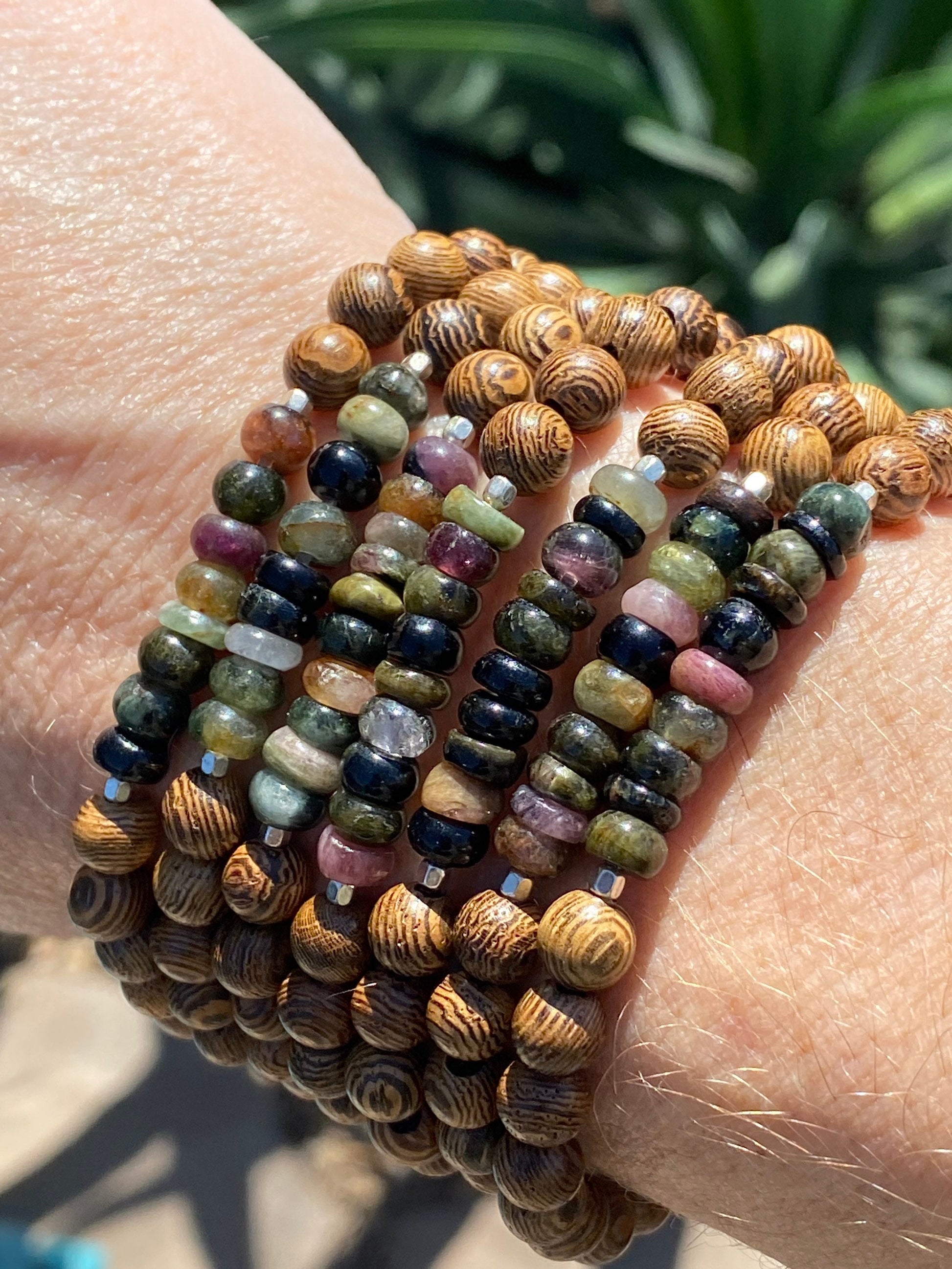 Watermelon Tourmaline Roundel & Wood Bracelet | Boho Bracelet | Wood Bracelet | Natural Stone Bracelet | Yoga | Meditation