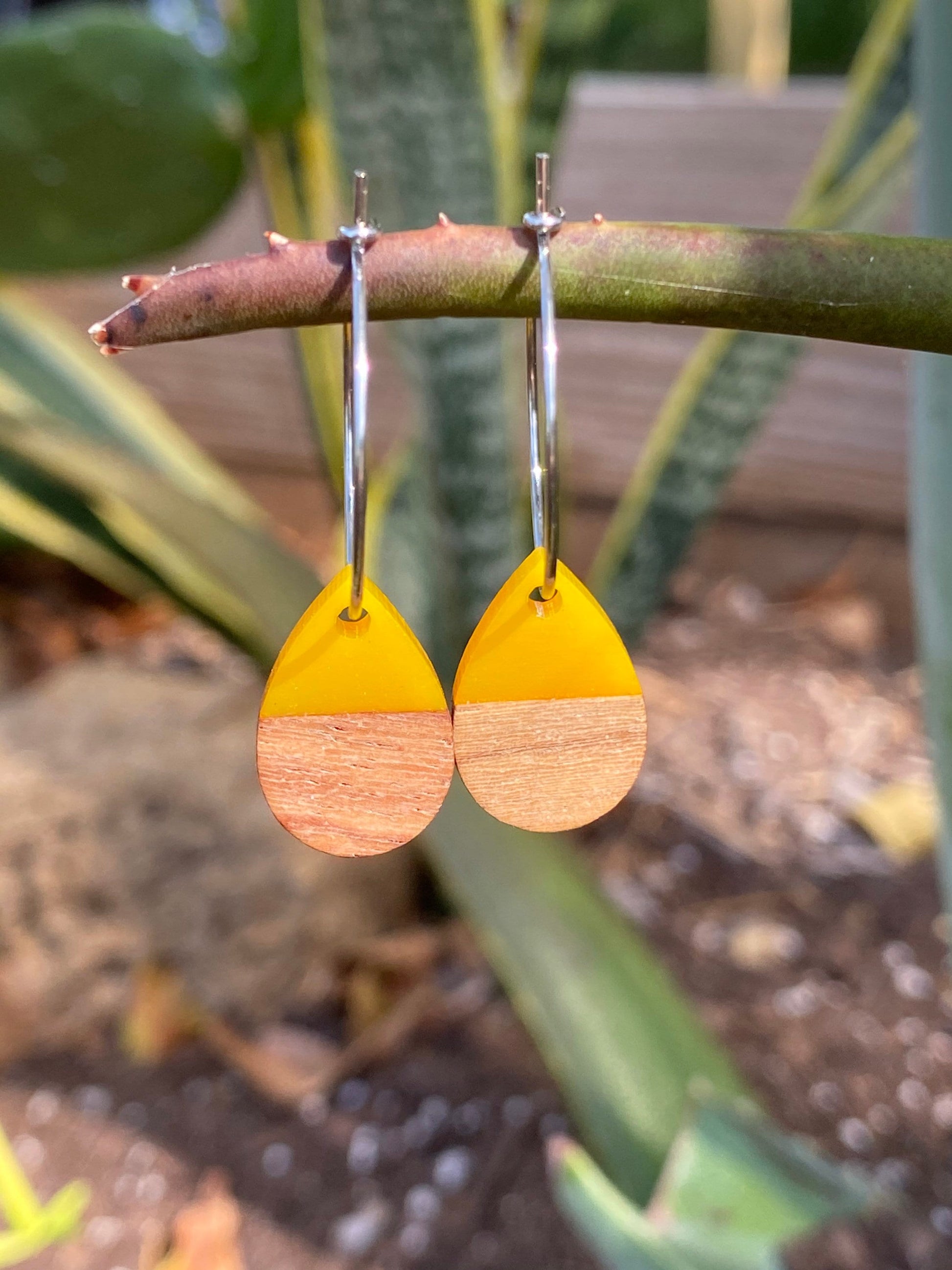 These earrings are made up of a 15.5mm long by 11.5mm Wood & Resin Tear Drop Dangle in Yellow that is on a 20mm Stainless Steel Hoop Earrings.